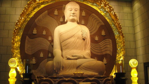 印度紅花崗岩雕琢而成的釋迦牟尼佛,鎮坐於大雄寶殿殿堂中央