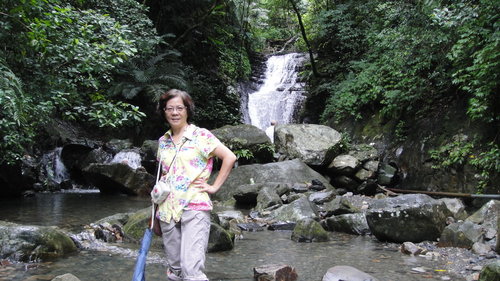 第一層瀑布沿石階步道陡上500公尺,綠意盎然,林蔭遮蔽,另一邊為砂頁岩交互的岩層壁